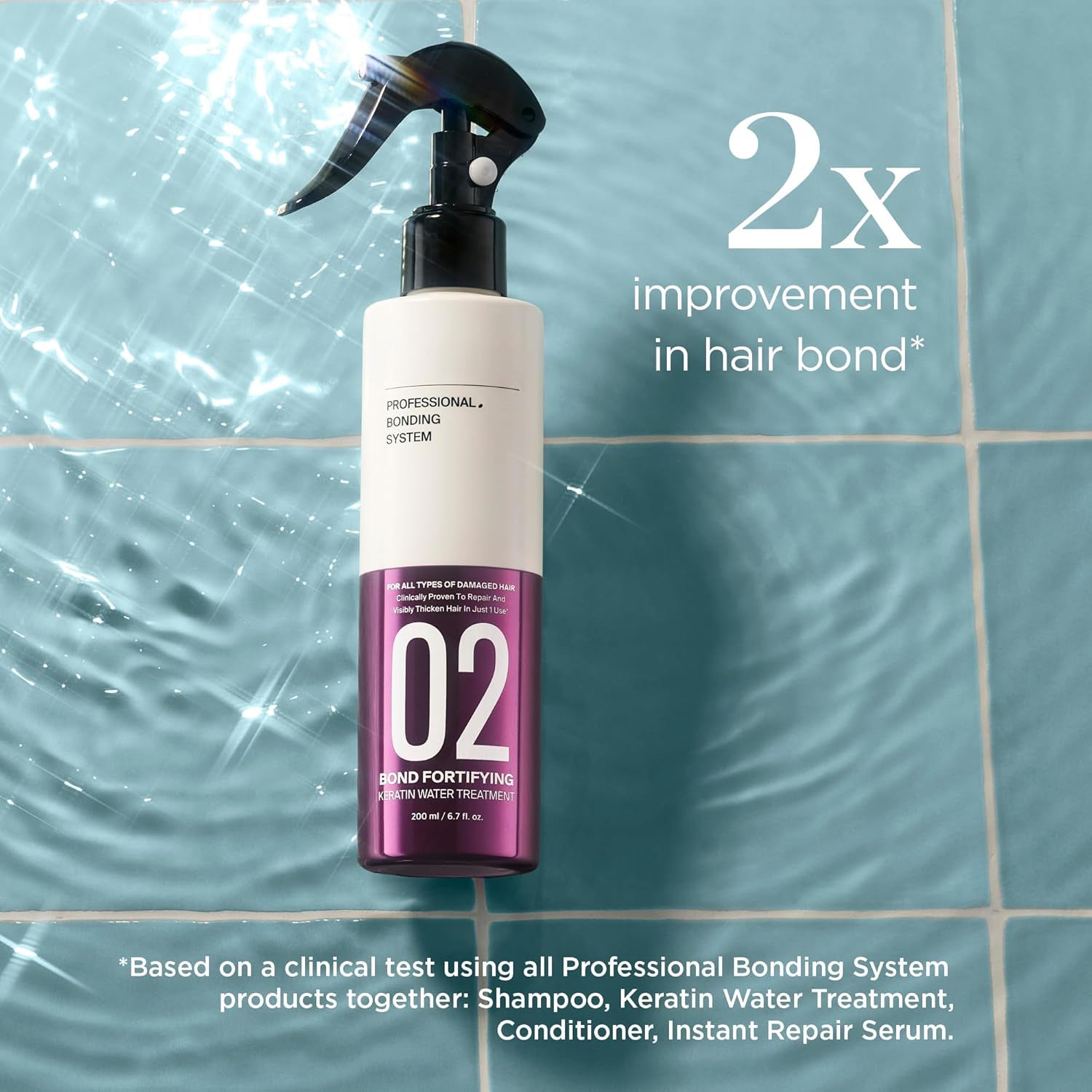 • Clinically proven to visibly repair and measurably thicken the look of hair in just one use* *Based on a clinical test using all Professional Bonding System products together: Shampoo, Keratin Water Treatment, Conditioner, Instant Repair Serum.